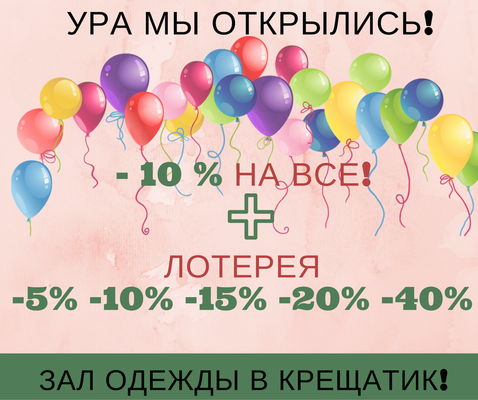 З 31.08.2018 за 10.09.2018 для всіх відвідувачів ЗНИЖКА на весь асортимент - 10%, а також, всі покупці беруть участь у безпрограшній лотереї знижок на касі. Виграй свою знижку до 50% на будь-яку річ. Знижки сумуються. Мінімальна знижка в магазині у цей період - 15%, максимальна - 50%! Приходьте та приводьте друзів і близьких, чим більше учасників, тим більше шанс виграти знижку - 50%!